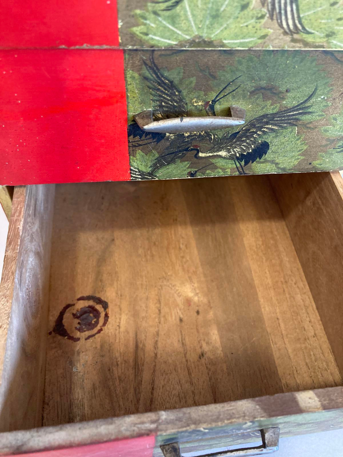 Discover the enchanting allure of this small wooden 3-Drawer box that is papered with gold and green cranes, a exquisite gem among vintage finds. Adorned with intricate green and gold crane motifs on aged papered panels and a bold red base, this compact tin box features delicate metal handles for easy access. Ideal for organizing jewelry, trinkets, or as a charming decorative piece on your vanity or shelf. In good vintage condition with some signs of wear and marks in the drawers that adds to its character—perfect for collectors of whimsical storage solutions!