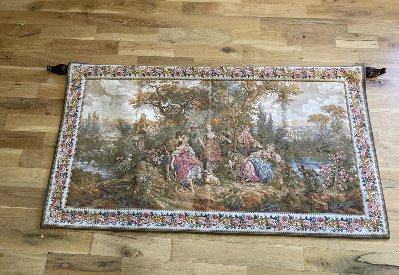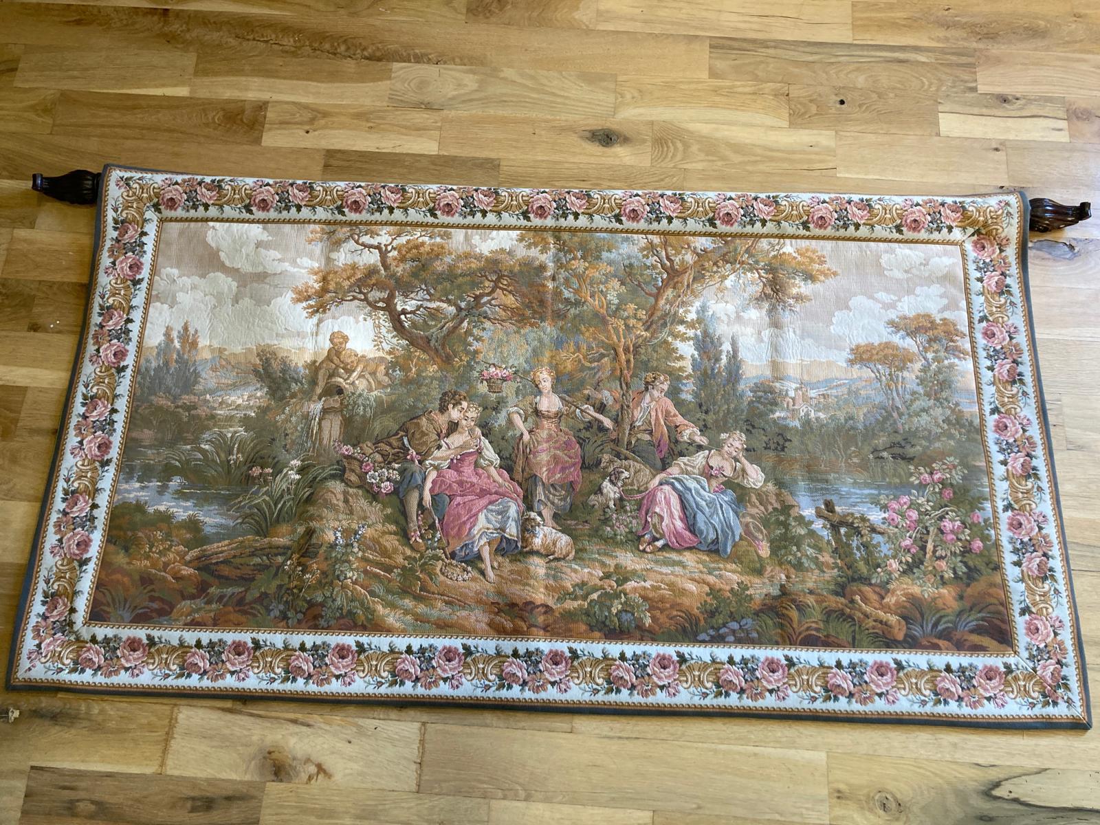 This stunning Gobelins tapestry was made in France and features a richly detailed pastoral scene with figures gathered in a lush countryside setting. The piece is framed by an ornate floral border with roses, adding elegance and refinement to the composition. Woven with soft, muted tones, it reflects the artistry and craftsmanship for which Gobelins is renowned. Includes solid wood tapestry hanging bar.