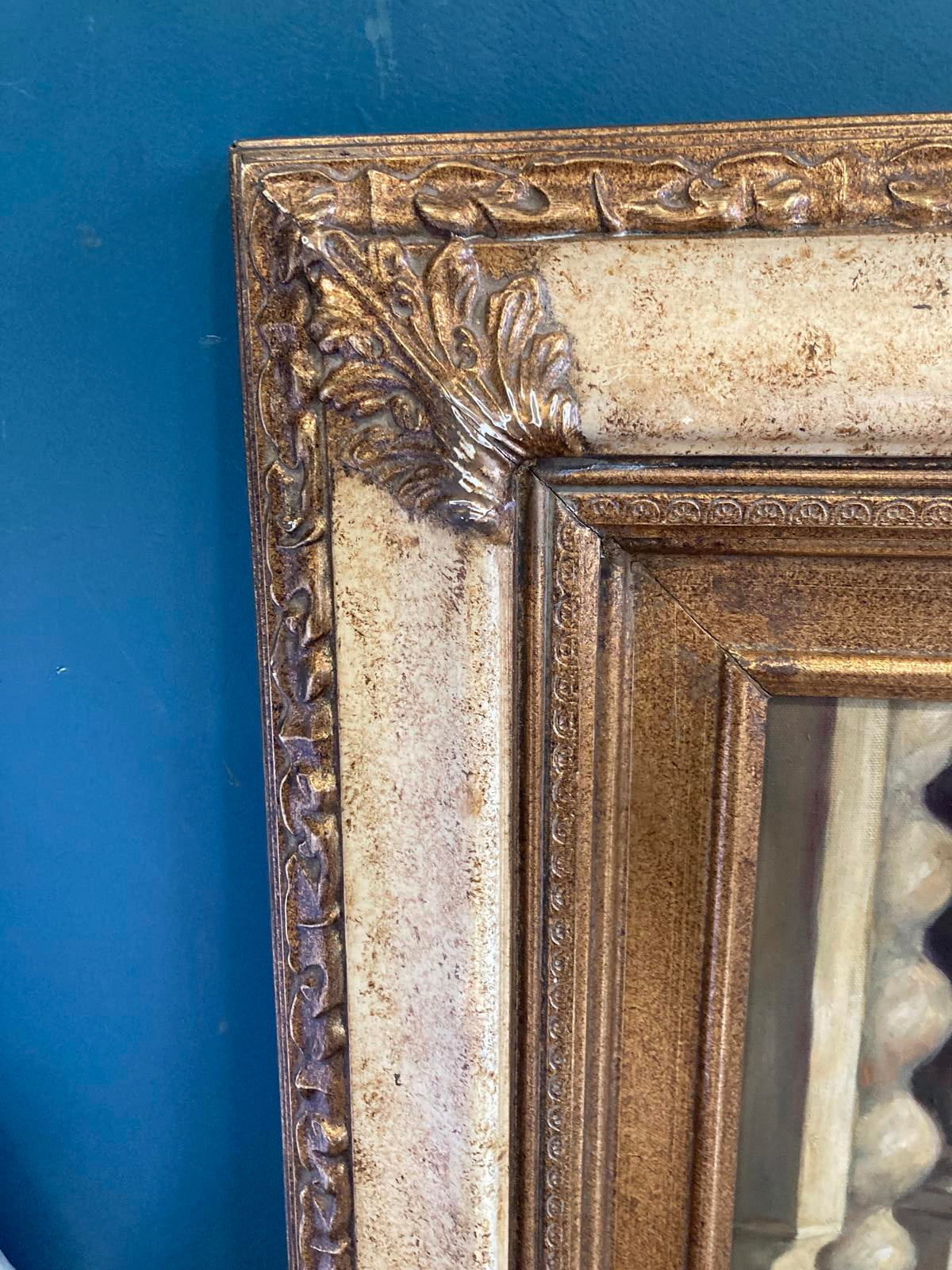 Beautiful reproduction of a work by Elizabeth Adela Forbes, featuring a tender scene of a mother and child seated together in soft white dresses, surrounded by vibrant florals. The richly detailed frame with antique gold and cream finish enhances the warmth and presence of this piece, making it a striking focal point in any home.
