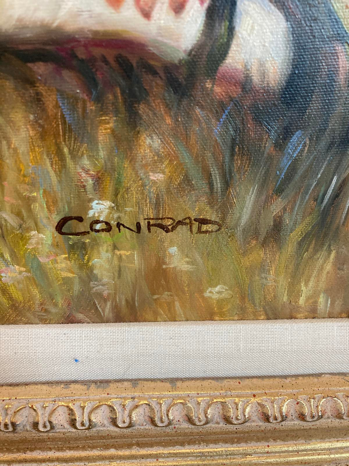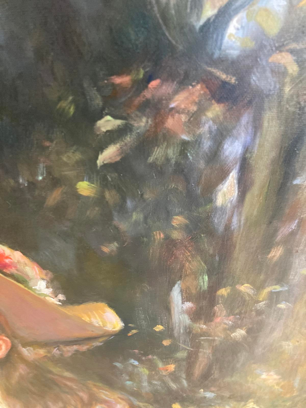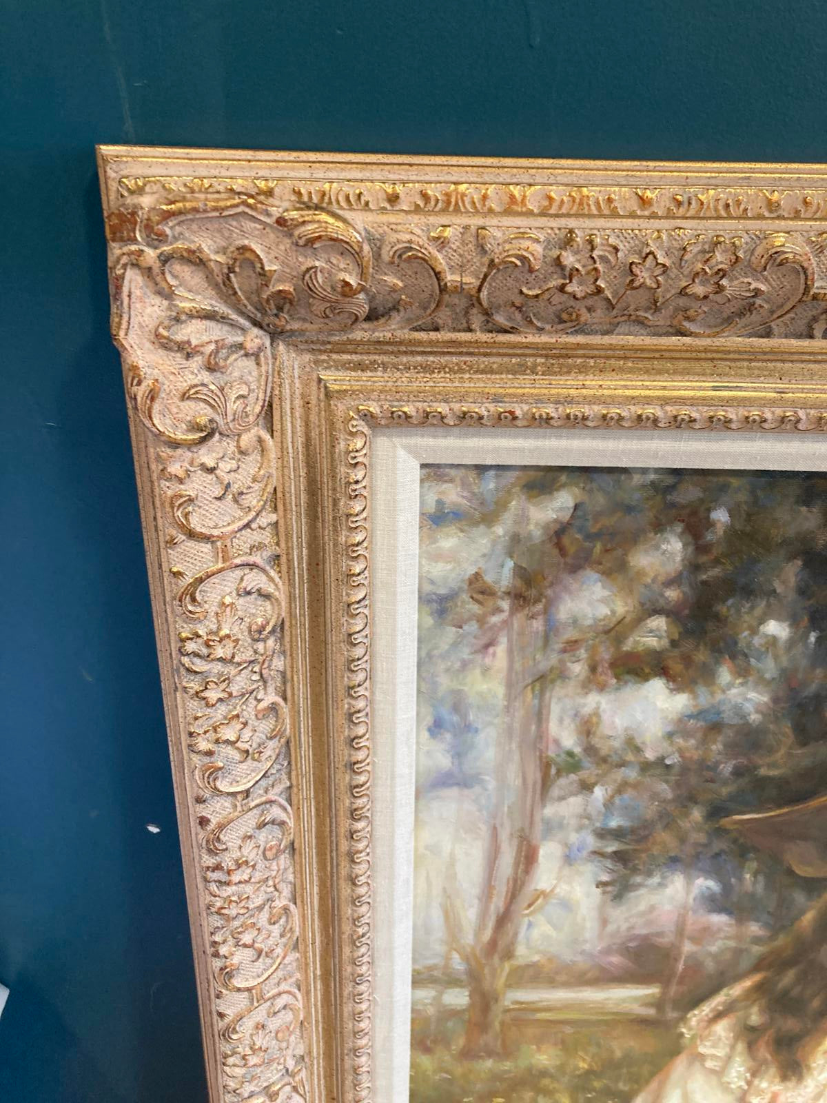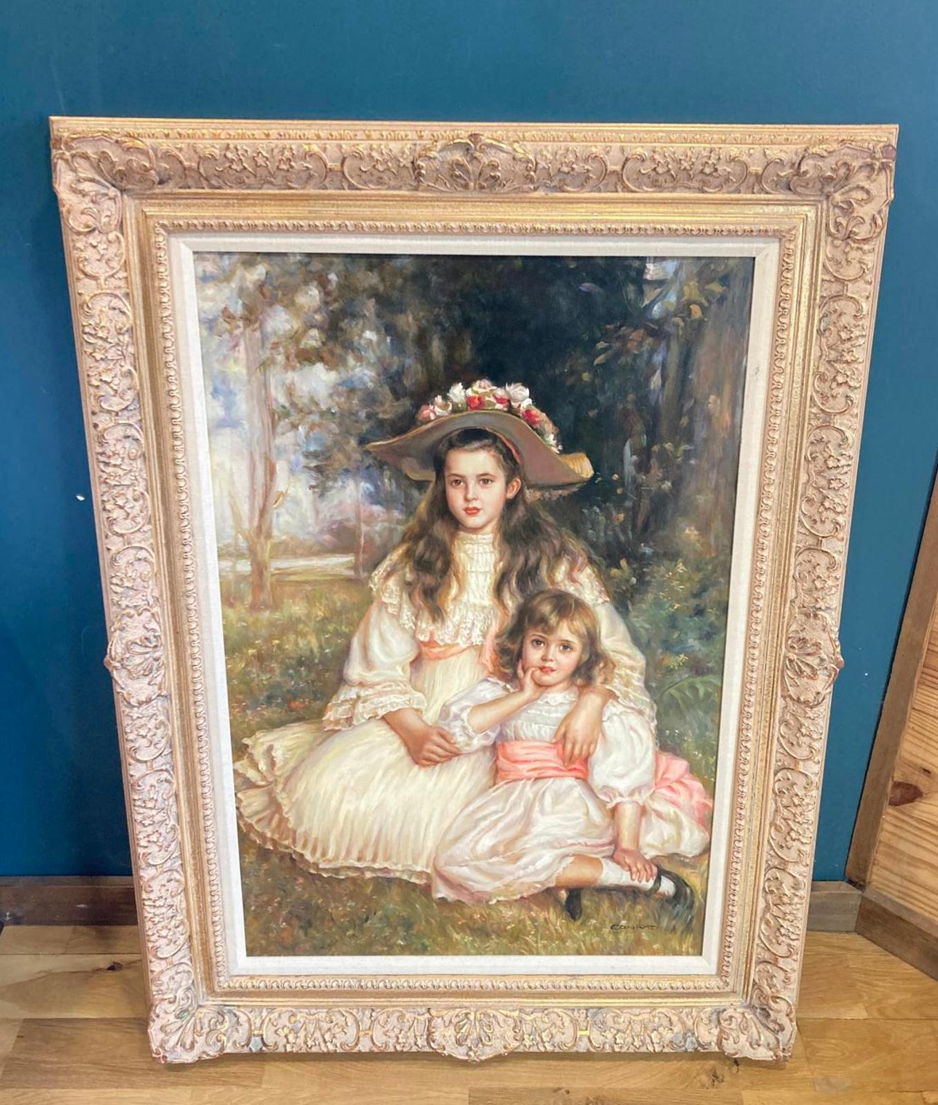 Beautiful large-scale reproduction of Robert Edward Morrison’s famous painting, featuring two young girls in a serene garden setting. The ornate carved frame with an antique gold finish adds depth and elegance, making this a stunning decorative piece for any traditional or vintage-inspired home.