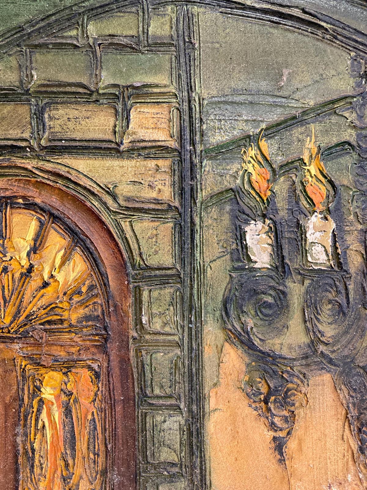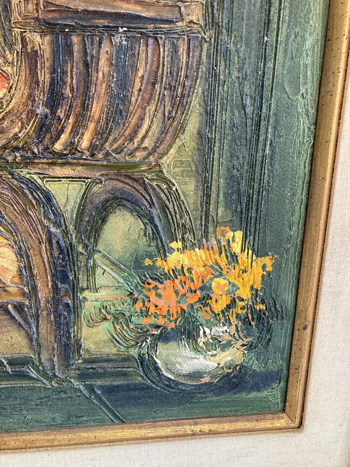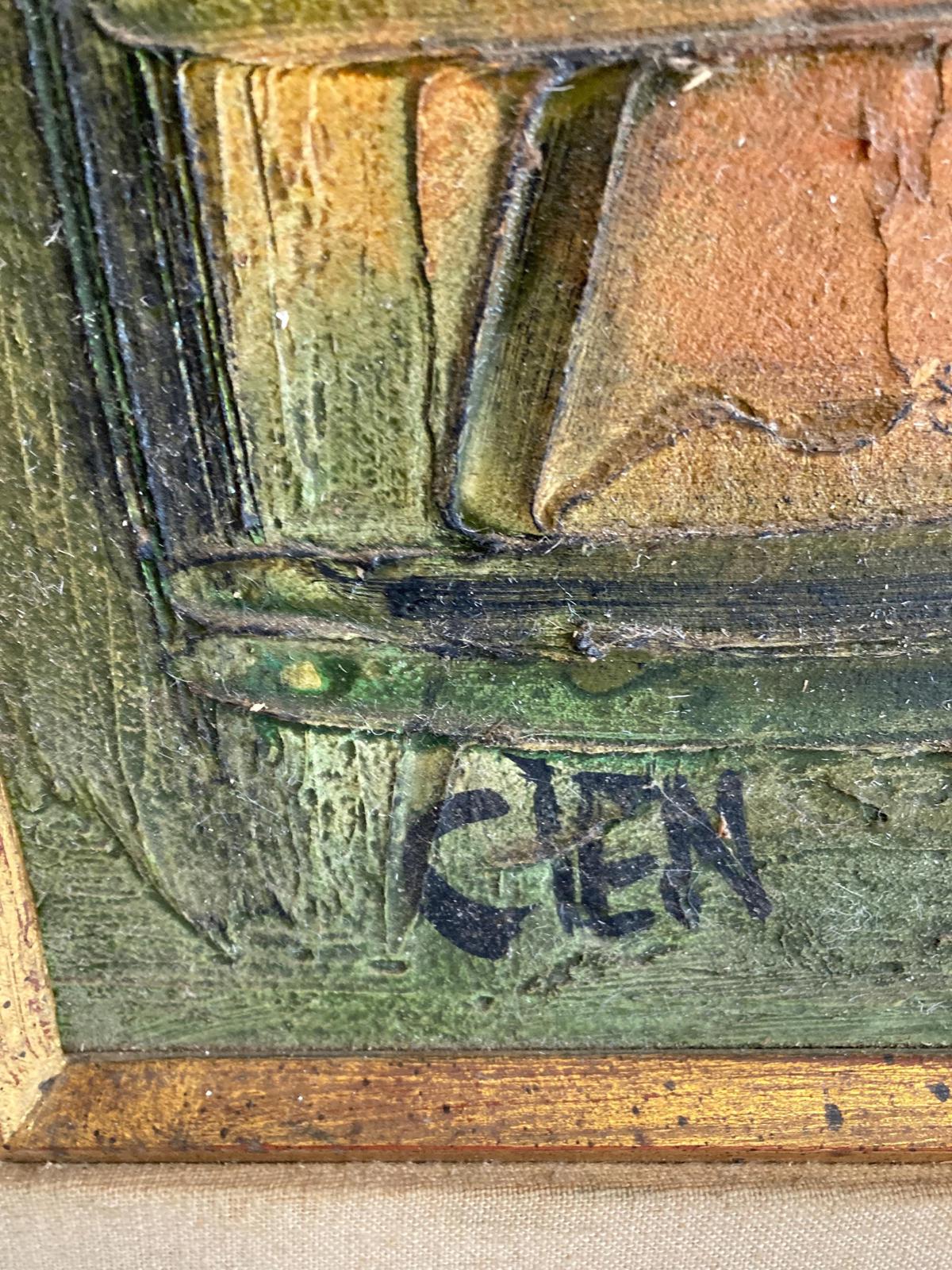 This original oil painting by Etta Benjamin Cien features a gothic door and stool. The vibrant paint brings this truly unique scene to life. Original handmade gold painted wood frame with linen. Signed by artist "CIEN". 31.5ʺW × 1.9ʺD × 43.75ʺH