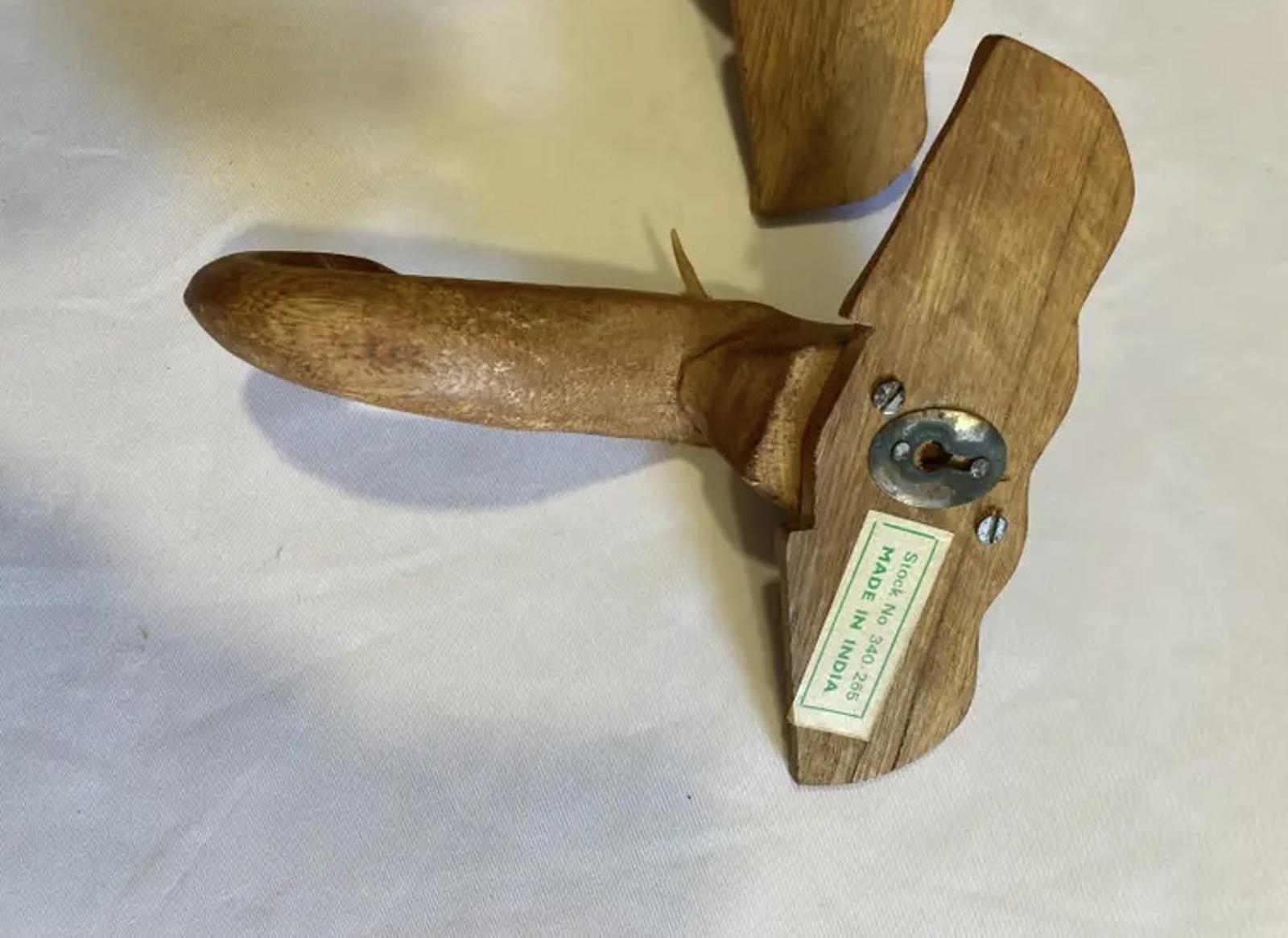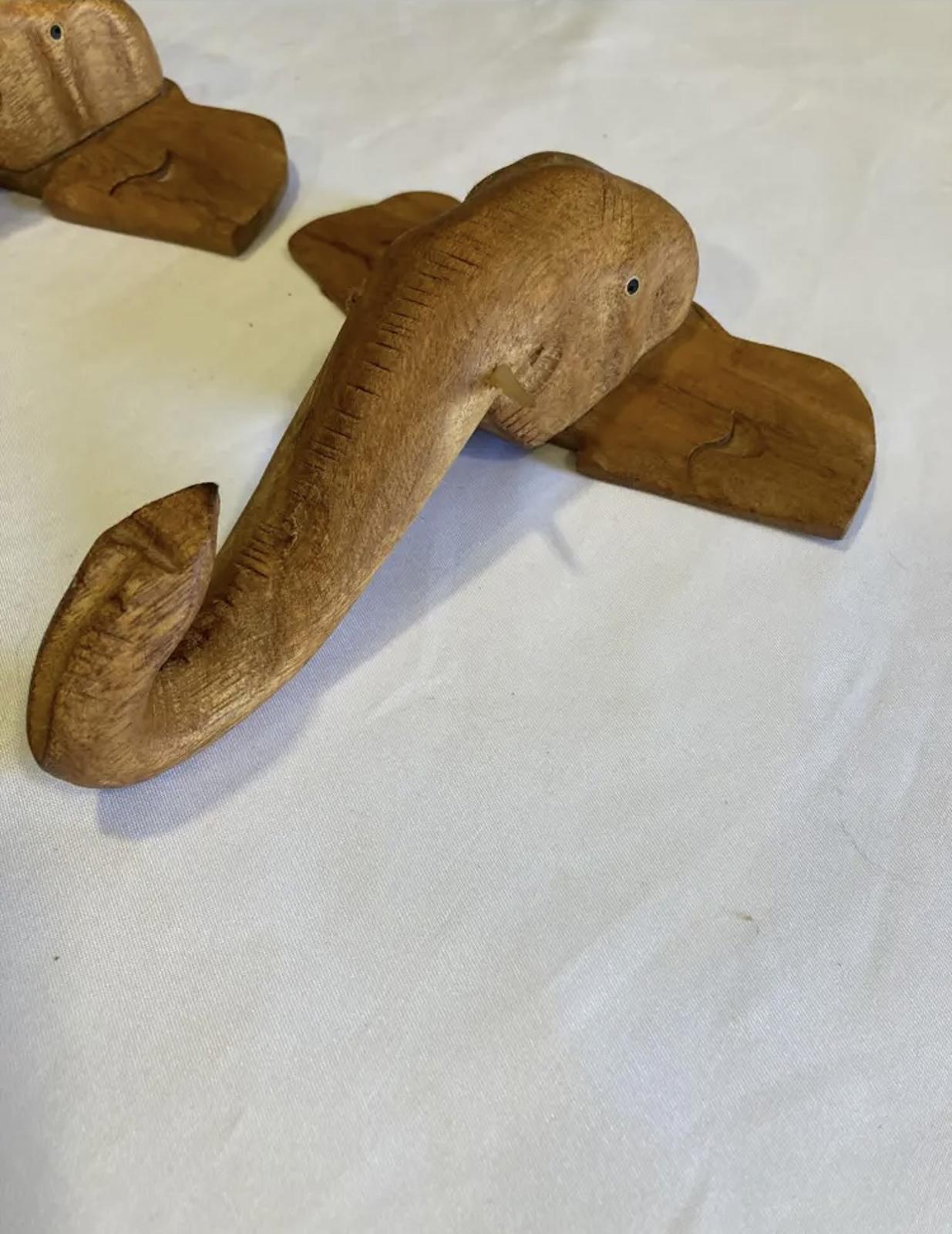 This pair of hand carved wooden elephant wall hooks brings a touch of rustic safari charm to any home. Crafted from solid wood, each elephant head features detailed carving with extended trunks designed to hold lightweight items. Perfect for an entryway, nursery, or as accent decor in a nature-inspired room. A beautiful addition for those who love unique vintage finds and handcrafted artistry. Some of the tusks are missing.
