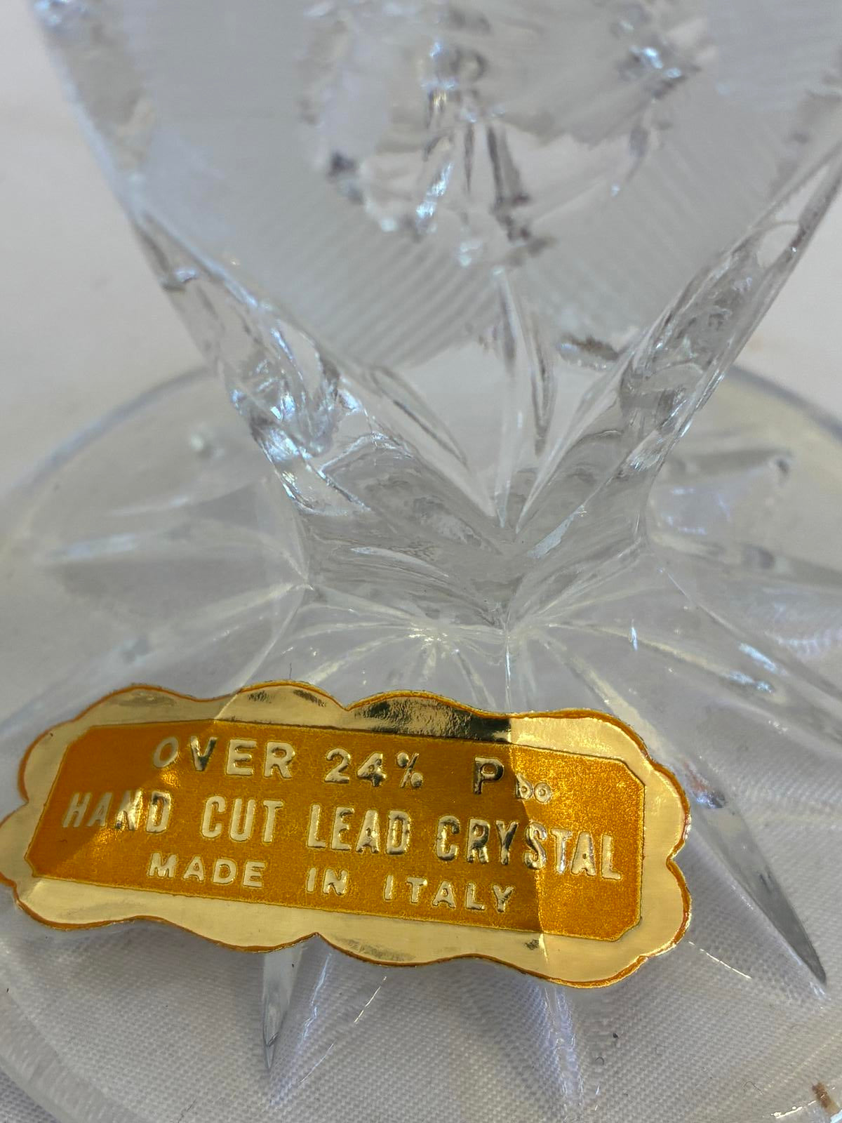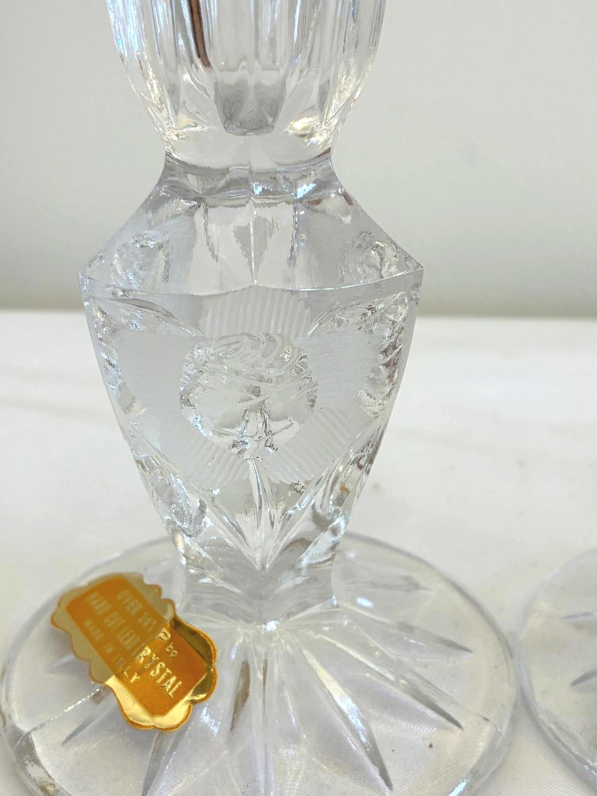 This elegant set of two vintage crystal candle holders was made in Italy by Rosa Di Roma. Crafted from hand-cut lead crystal, these holders feature faceted details, a sculptural silhouette, and beautiful light-catching clarity. Original foil labels noting Italian crystal craftsmanship remain intact.