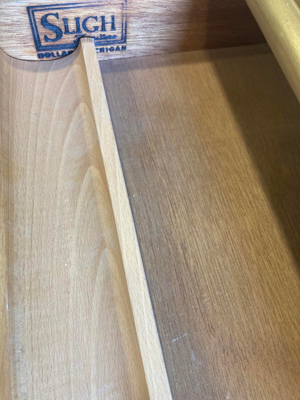 This elegant Sligh Furniture French Provincial desk comes complete with a matching chair, showcasing graceful curves and refined craftsmanship. The desk features a light cream painted finish with leather top and gilt accents, bow-style brass drawer pulls, and five drawers for convenient storage. The coordinating chair includes a cane back, carved wood frame, and an upholstered seat in a golden damask fabric, adding a touch of sophistication.