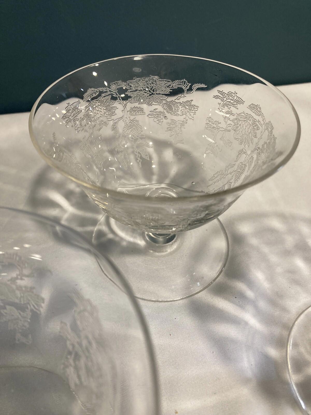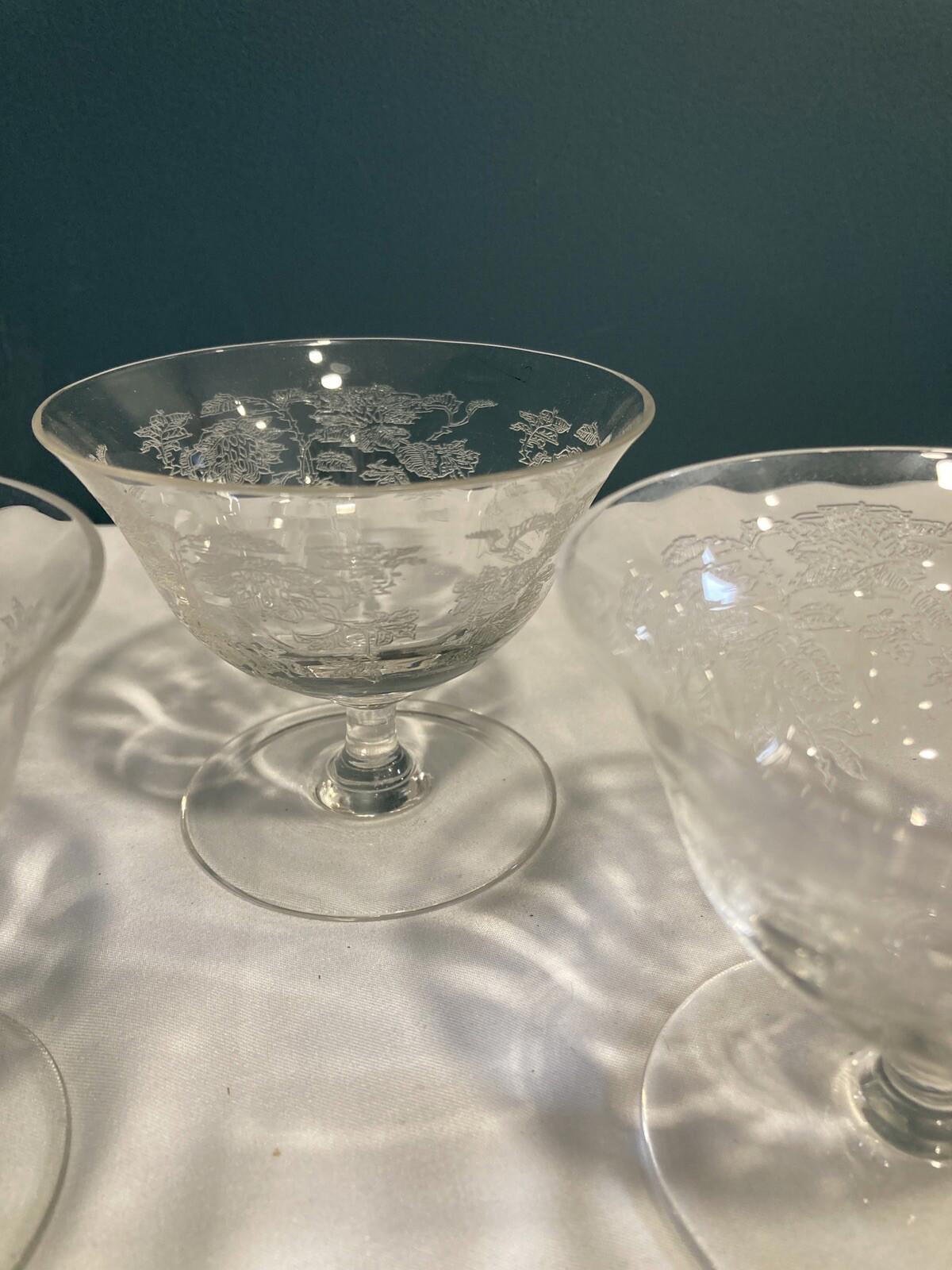 Set of 3 vintage Tiffin Etched Rose champagne coupe glasses featuring delicate frosted rose and floral garland detailing. These elegant vintage finds reflect the refined craftsmanship Tiffin Glass was known for, with beautifully balanced proportions and soft etched decoration.