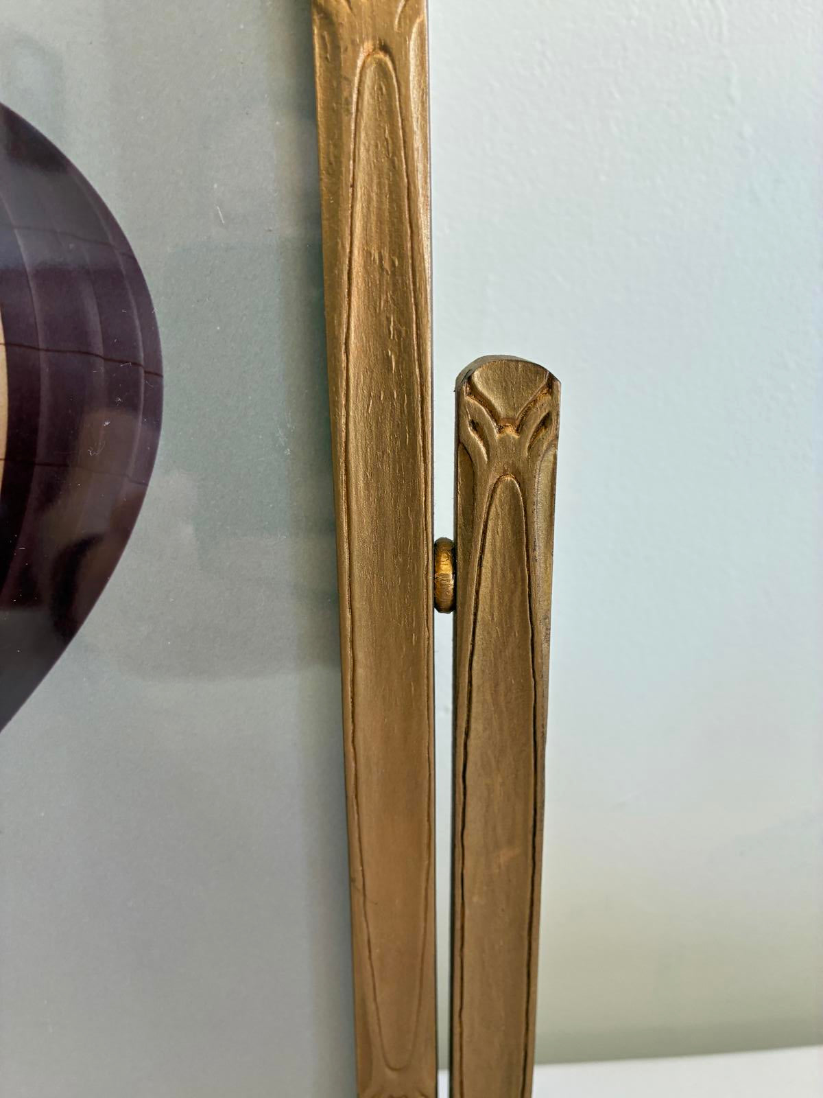 Vintage gold tone swing picture frame featuring an elegant Art Deco inspired base with sculptural vertical supports. The center frame panel is suspended and gently swings within the side columns.