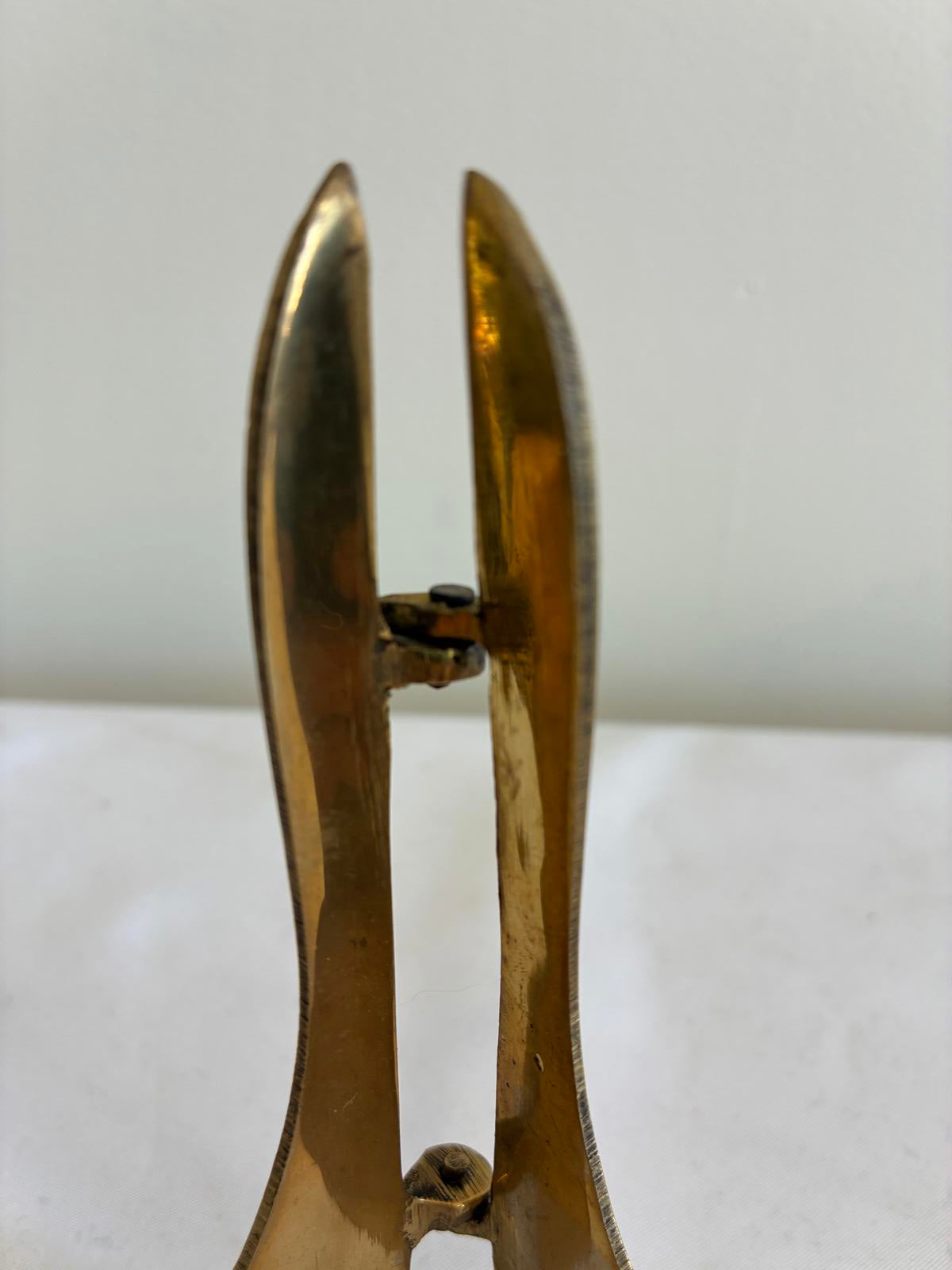 his vintage finds brass folding display easel features a sleek, sculptural silhouette with curved feet and an adjustable center hinge. Its warm aged brass finish adds a refined Hollywood Regency and Mid-Century Modern touch to any display.