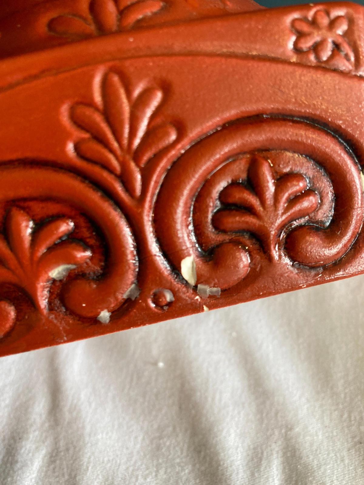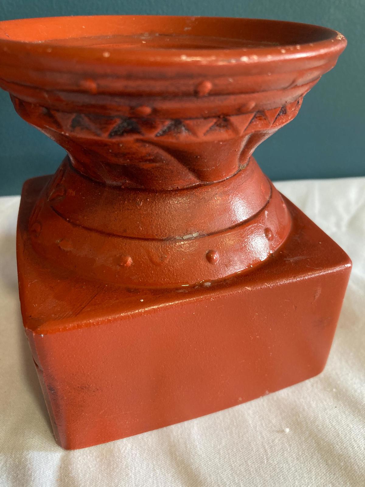 This vintage set of three brick red ceramic candle holder stands brings warmth and character to any space. Each piece is hand painted, showcasing subtle glaze variations and small scratches that add to their vintage charm. Perfect for a dining table centerpiece, mantel display, or eclectic shelf styling, this trio makes a striking decorative accent. A beautiful addition to your collection of vintage finds.