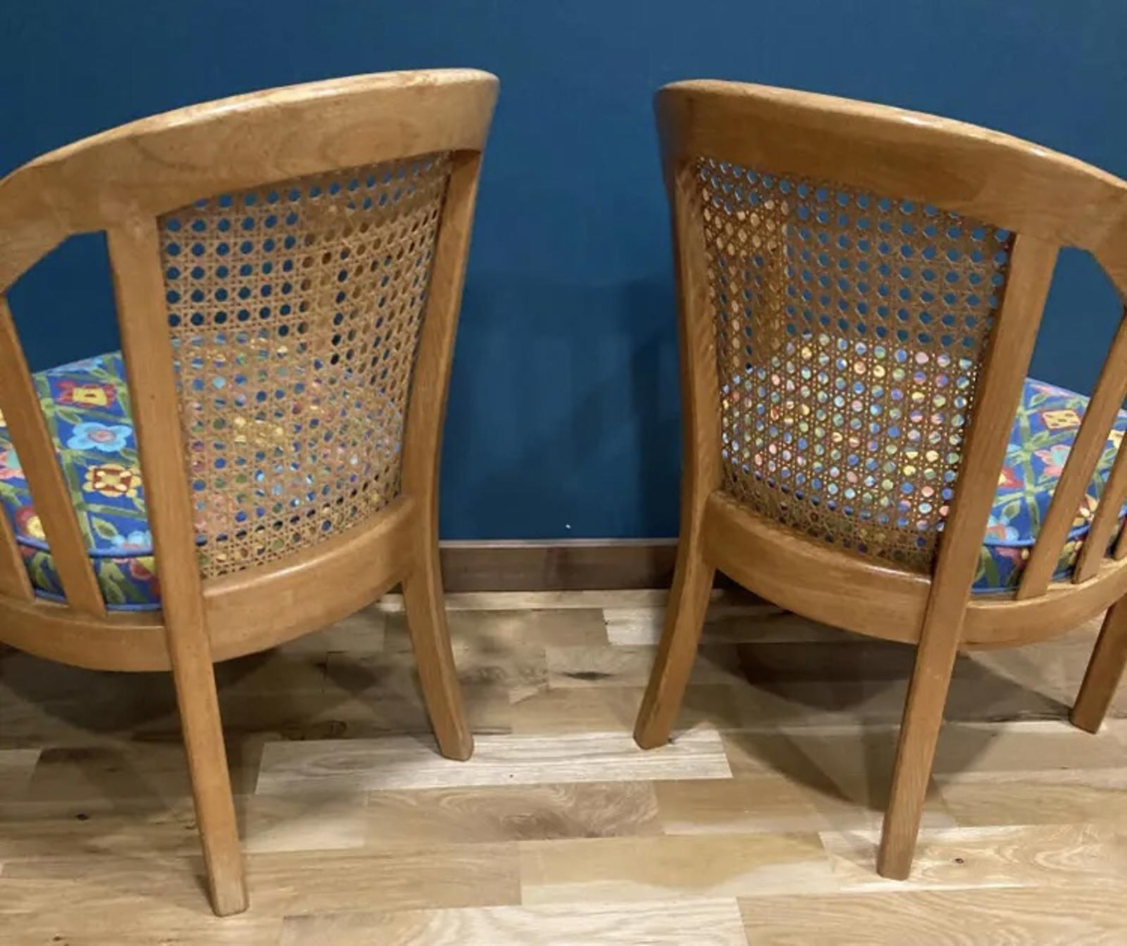 The combination of natural materials—wood and cane—with the colorful upholstery makes these chairs incredibly versatile. They work beautifully as dining chairs, desk chairs, accent seating, or as a cozy conversation set. Perfect for boho, eclectic, cottage, or mid-century inspired interiors, this pair is ready to add personality and functional seating to your home.