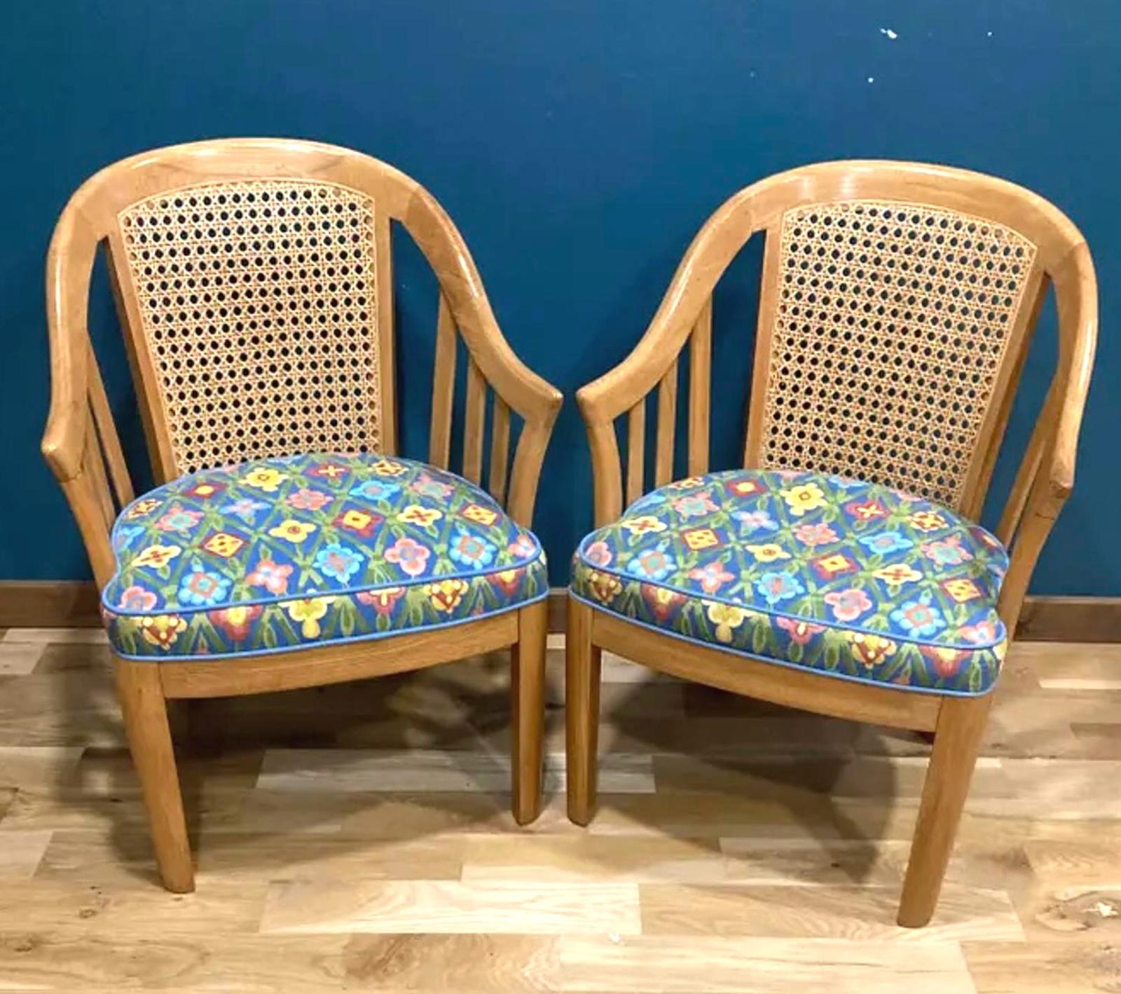 This charming pair of vintage cane back chairs are delightful vintage finds that bring both style and comfort to any space! Featuring classic barrel-back design with gracefully curved arms, these chairs showcase beautiful natural cane backing that adds texture and timeless appeal.