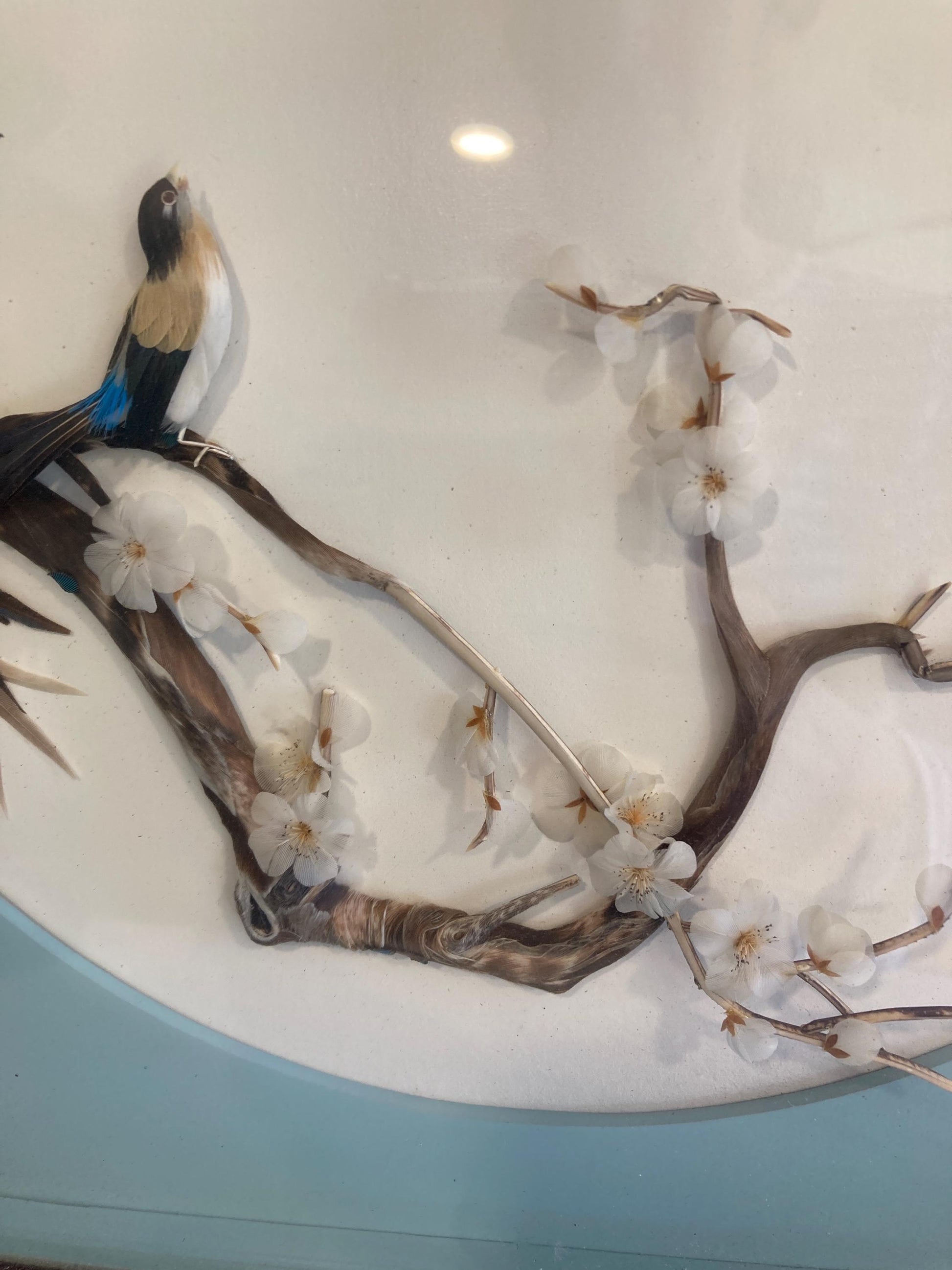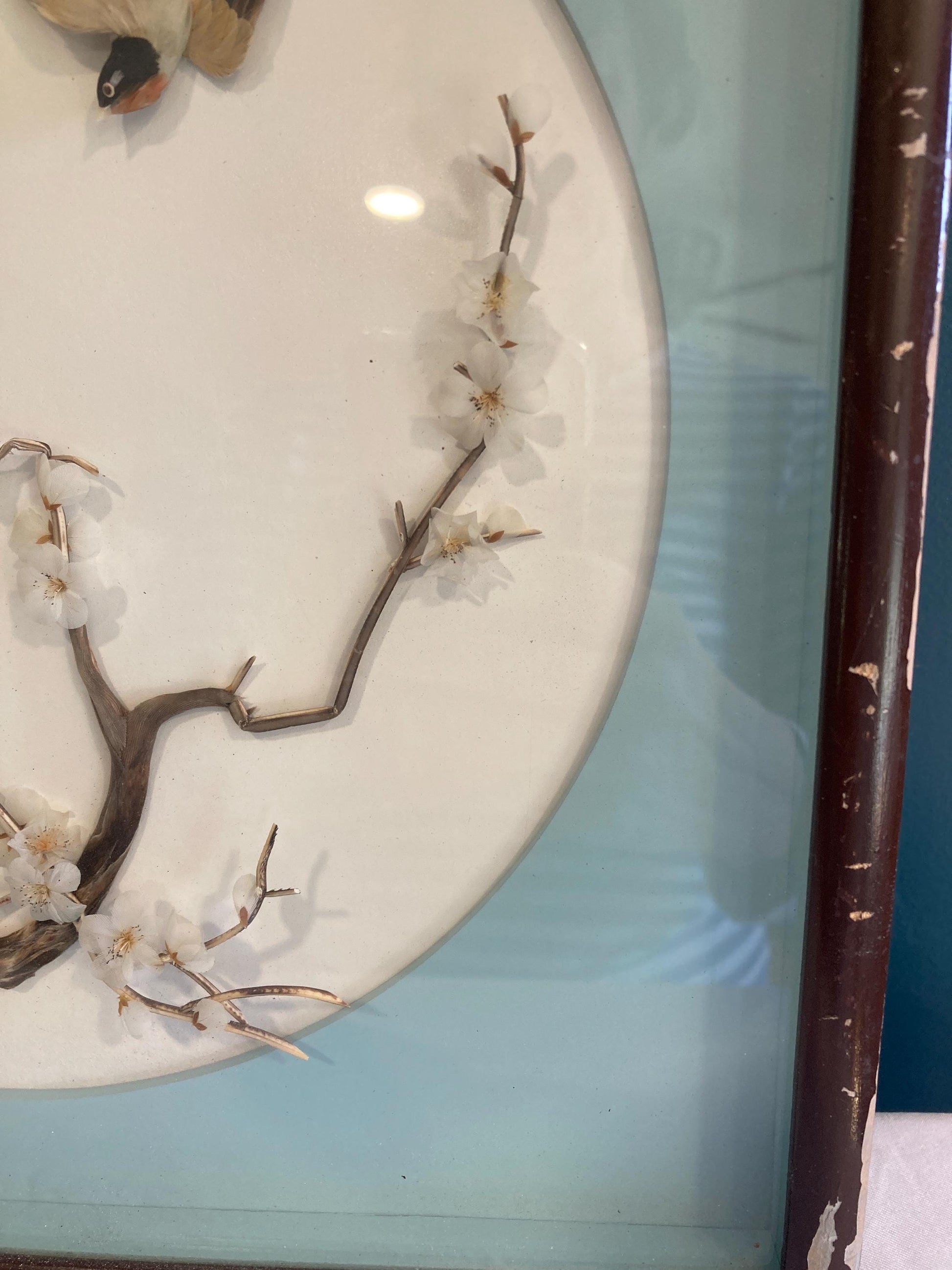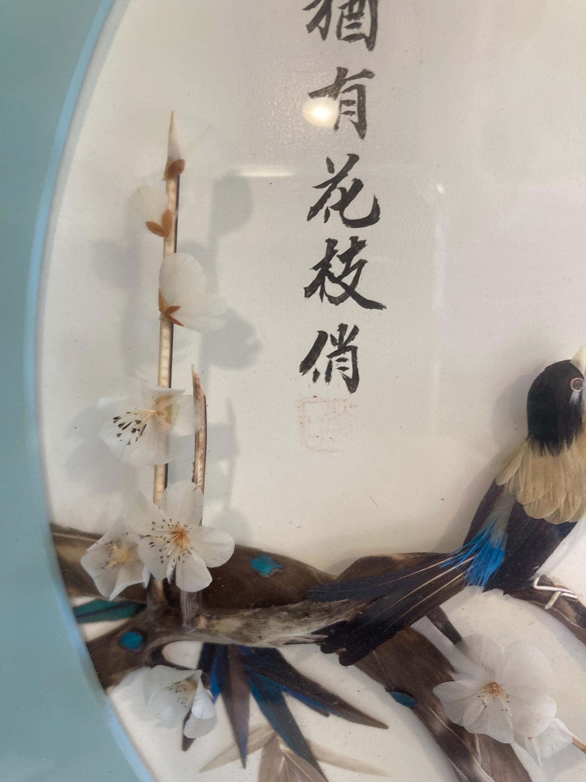 Vintage Chinese 3D Birds Picture Asian Mosaic Feather Art in Shadowbox wood Frame