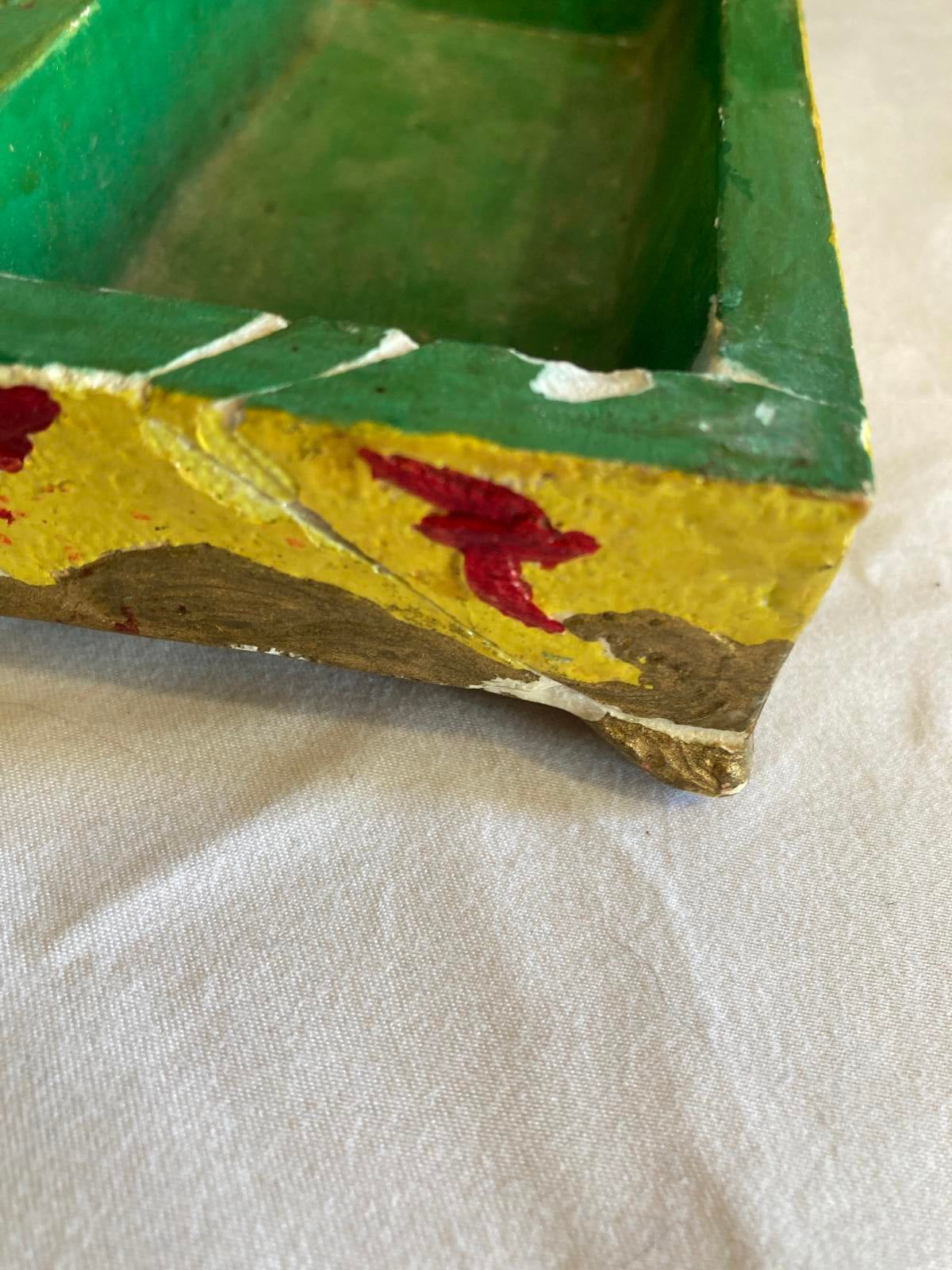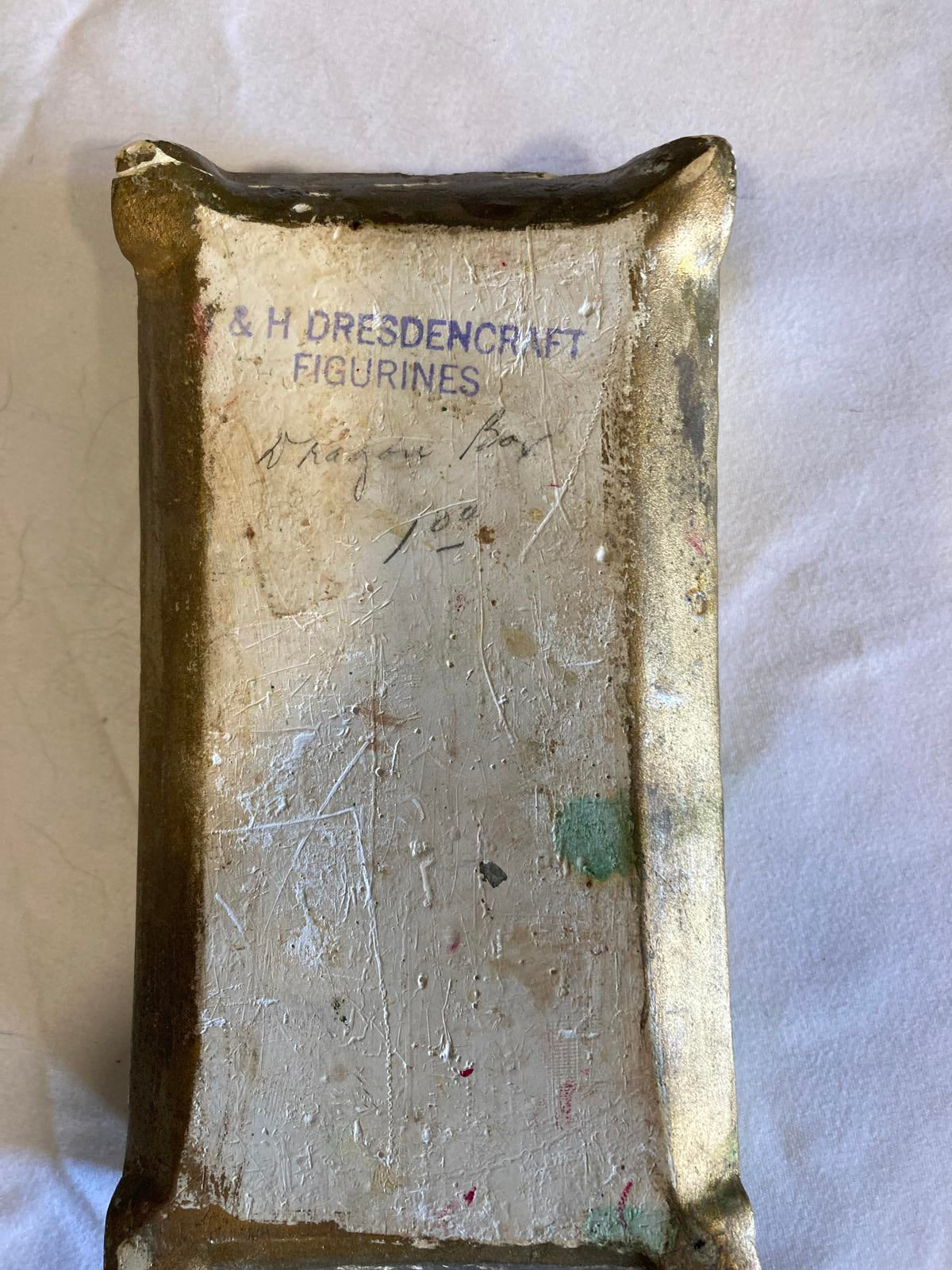 Unleash a touch of mythical allure with this Dresdencraft Dragon Ceramic Box, a captivating piece among vintage finds. Adorned with a vibrant green dragon motif, intricate Chinese characters, and bold red and gold accents on a yellow base, this lidded box exudes exotic elegance. Perfect for storing trinkets or as a striking display in your collection, it measures approximately 6" W x 3.25" D x 2.5" T. Some signs of wear and chips. One spot has been glued back together. Very unique dragon box!
