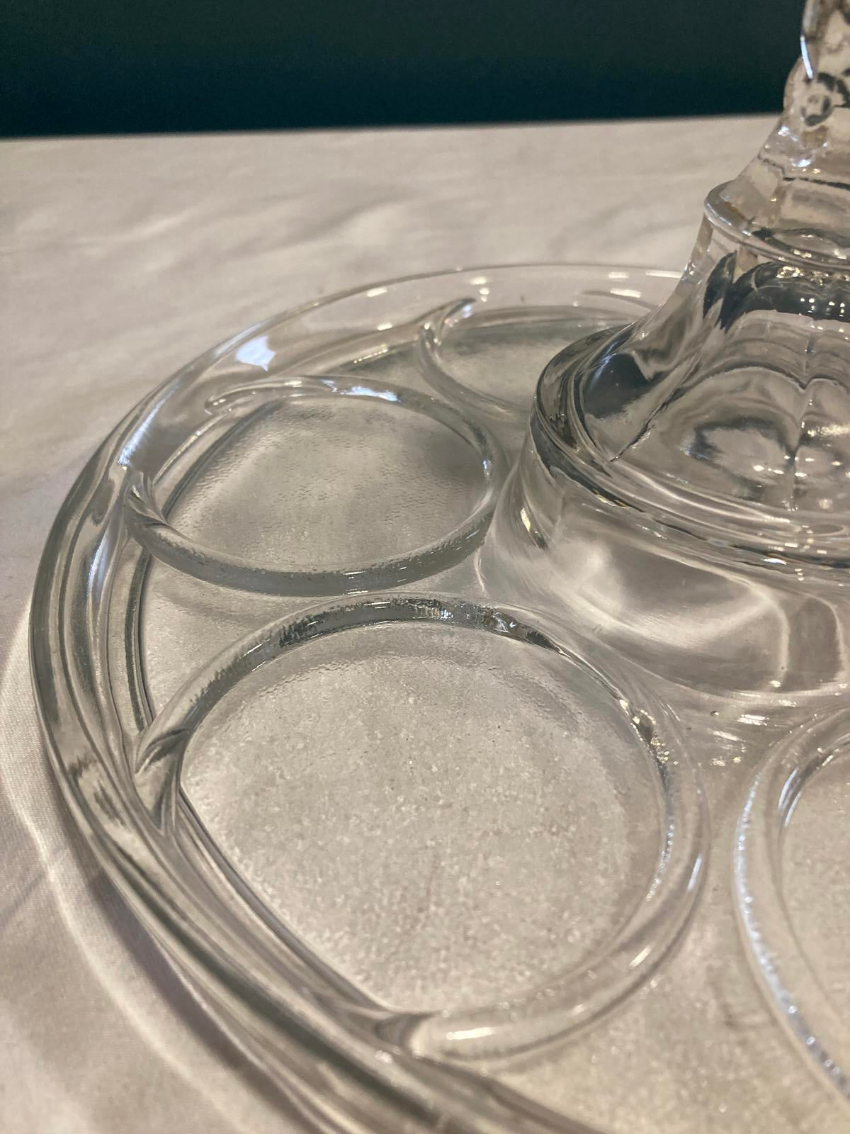 Add a touch of retro elegance to your kitchen with this vintage glass cup holder stand. Crafted from clear glass with a beautifully twisted handle, it features six circular holders perfect for holding cups or small treasures. This vintage finds piece is both functional and decorative, ideal for a bar cart, collectors, or farmhouse-style decor.