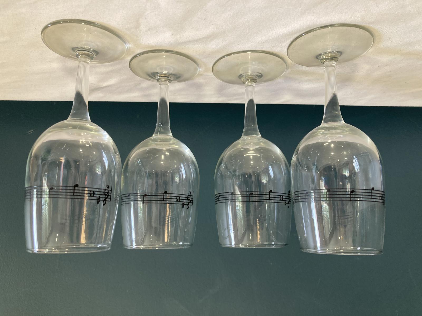 Bring a harmonious touch to your table with these vintage musical note wine glasses, featuring elegant black musical staff designs on clear glass. A delightful addition to vintage finds, these glasses are perfect for music lovers or as unique barware. This set of four is in excellent condition, ideal for parties or a sophisticated home bar. Add a melodic charm to your collection today!
