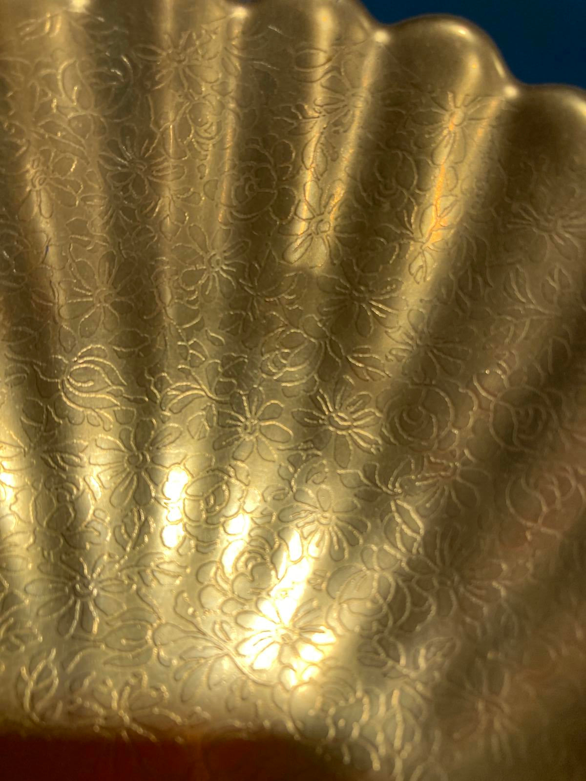 Infuse your space with luxurious glamour using this exquisite vintage Pickard gold seashell dish, handcrafted in fine china with 24K gold detailing. The scalloped shell shape features intricate etched floral motifs of delicate roses and daisies, creating a radiant, antique-inspired centerpiece. Perfect for holding jewelry, candies, or as a soap dish, this 1930s-era treasure adds opulent charm to vanities or tables. A shimmering standout among vintage finds, it's a collector's delight with timeless elegance.