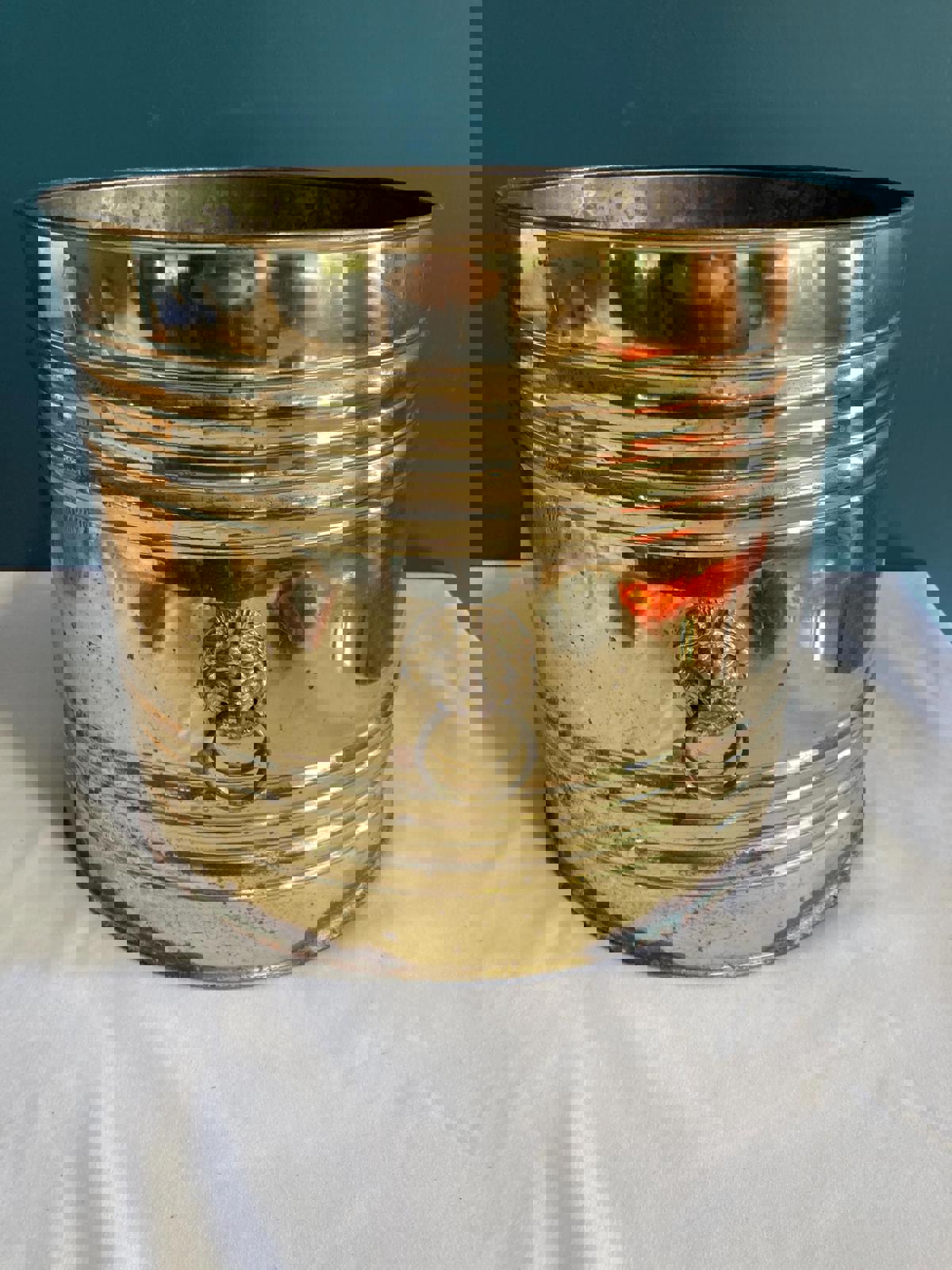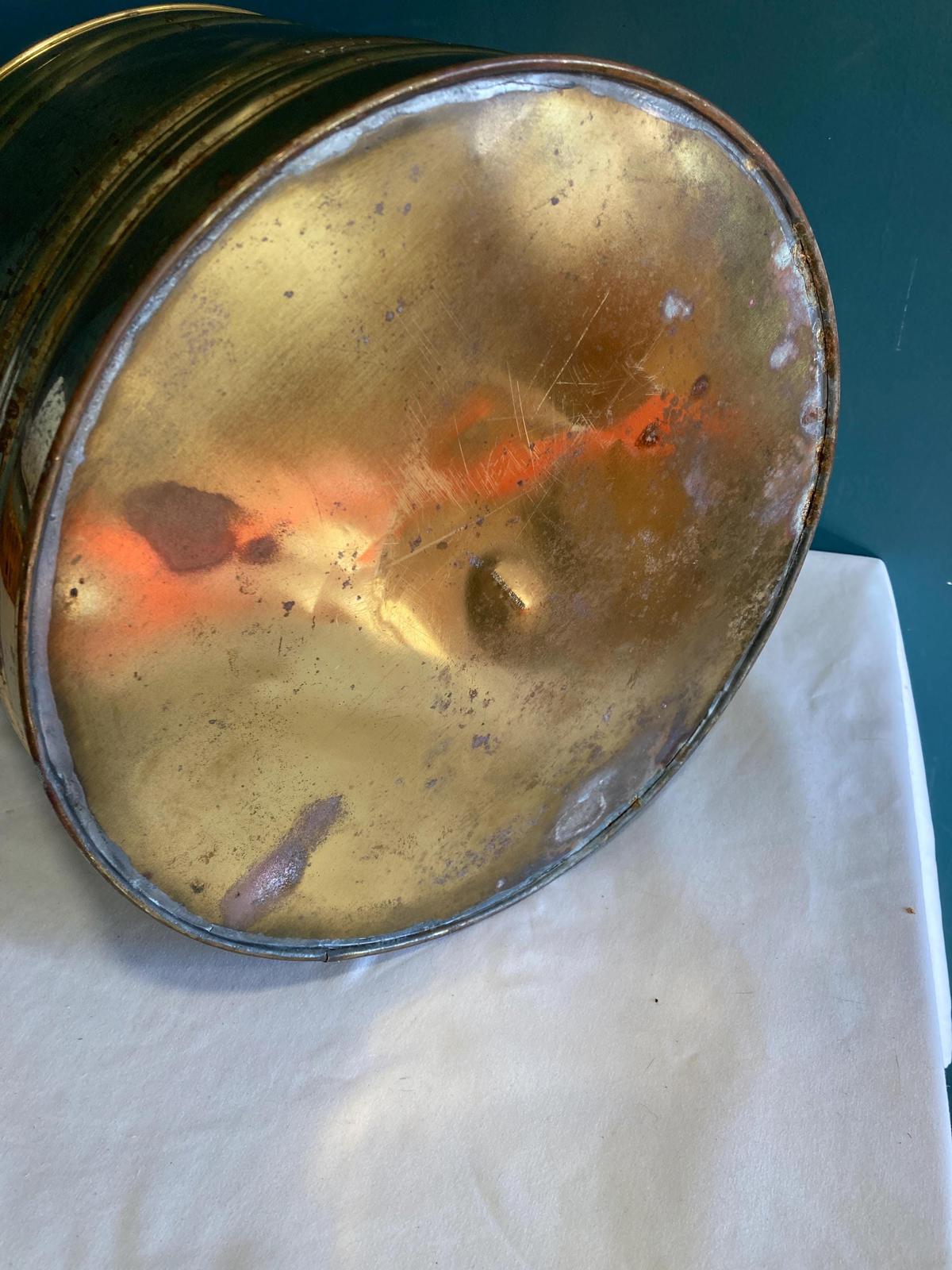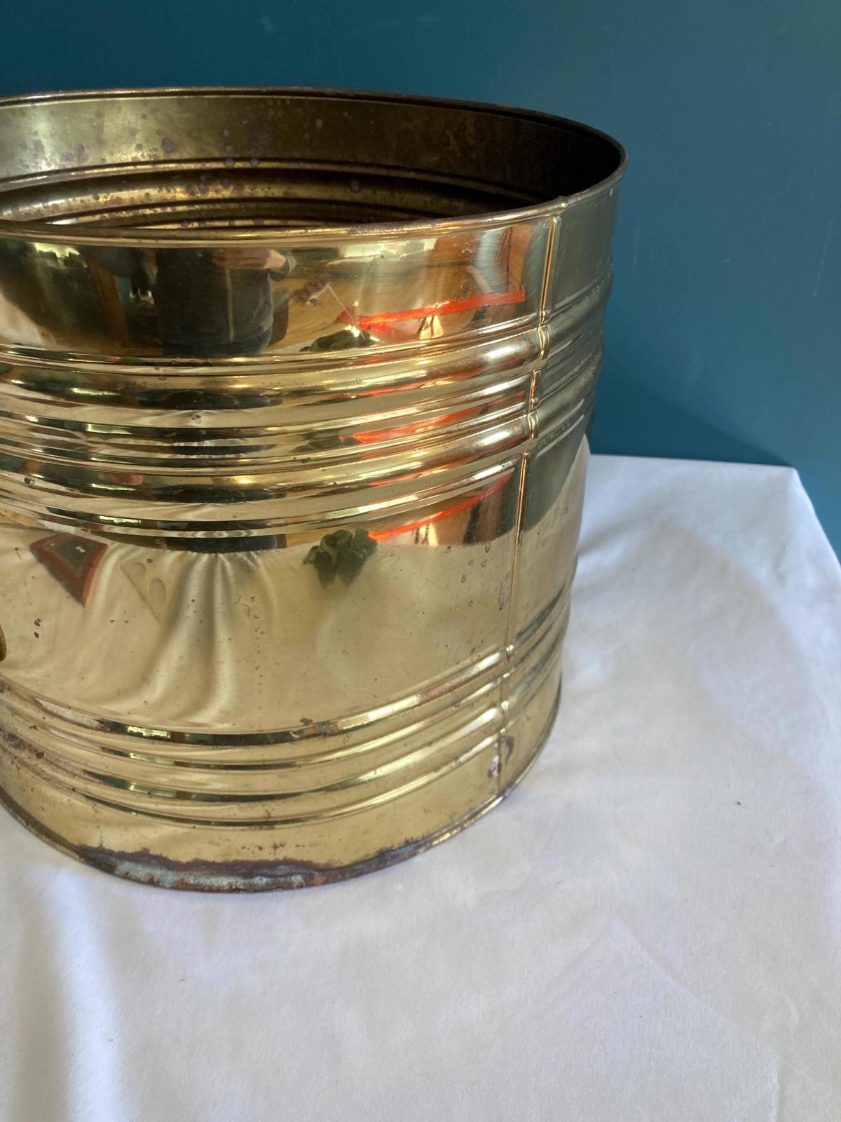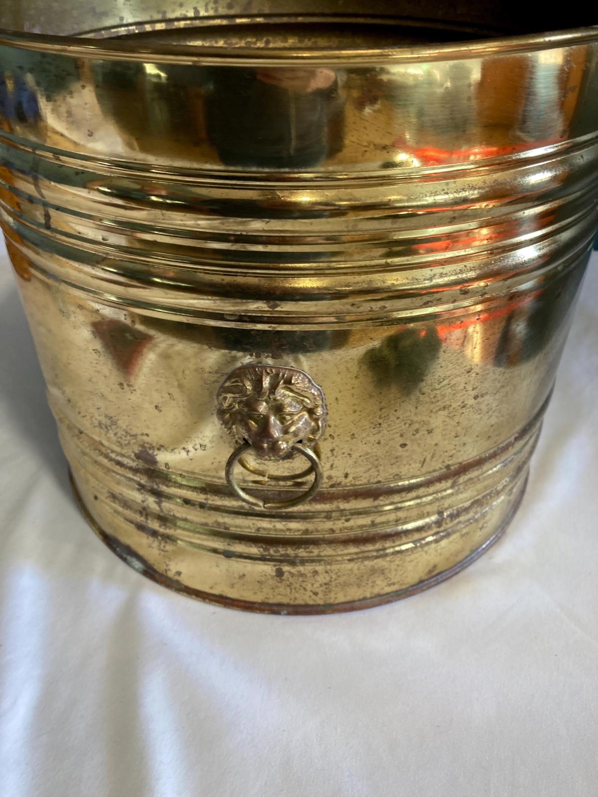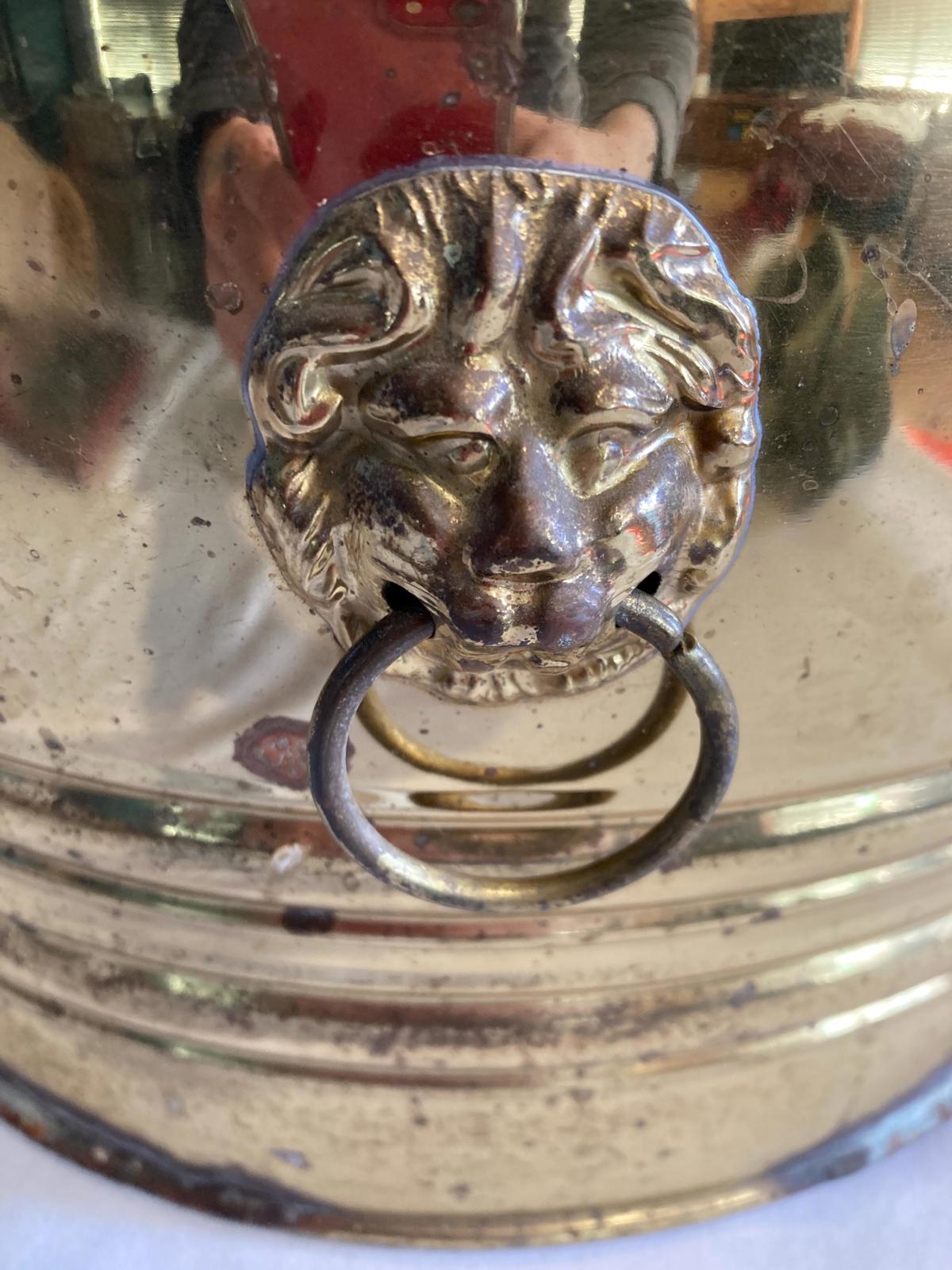 Rare vintage brass ash bucket or planter featuring regal lion head handles in classic Regency style. This eye-catching piece was made in England and adds charm to any farmhouse, Victorian, or traditional decor.