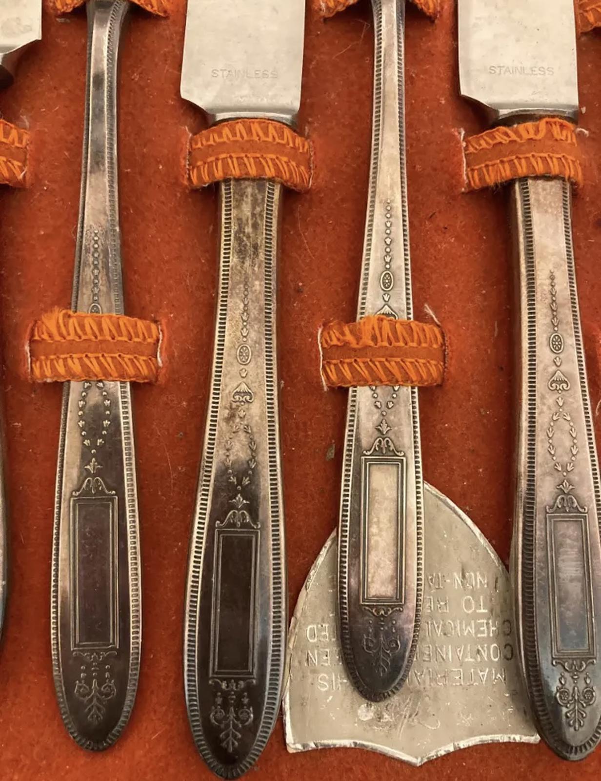 This 30-piece vintage silverplate flatware set by Oneida comes complete with its original storage case, offering both style and practicality for entertaining. Each utensil showcases classic mid-century craftsmanship, with elegant handles and a timeless shine that elevates any dining table. The case features an orange interior with blue fabric exterior that buttons, keeping your pieces protected and organized. A charming choice for collectors of vintage finds, or for those who love setting a refined, nostalgic table.